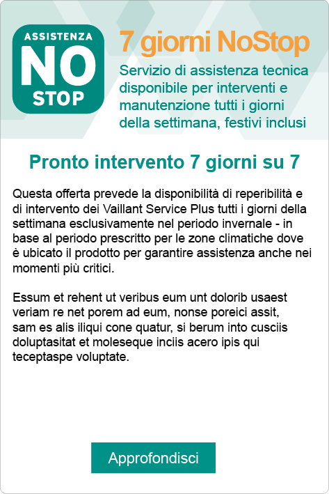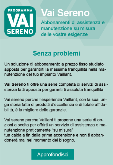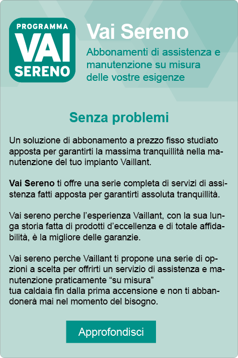 Siamo uno degli oltre 500 Centri Assistenza Tecnica Ufficiali con cui Vaillant vuole garantire ai clienti la massima esperienza di prodotto e di servizio. Una rete di professionisti selezionati e formati direttamente da Vaillant, che garantisce interventi nelle 24 ore, ricambi originali, estensioni della garanzia, programmi di manutenzione personalizzati e consulenza per la gestione delle pratiche relative alle detrazioni fiscali e agli ecoincentivi.